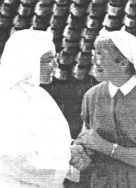 This is a photograph of Mother Mary Augustine making her First Profession, momentous occasion in our Association's history. Here Mother receives her black veil from our Father Abbot, Eugene Hayes, St. Michael's Abbey, Orange, California. |